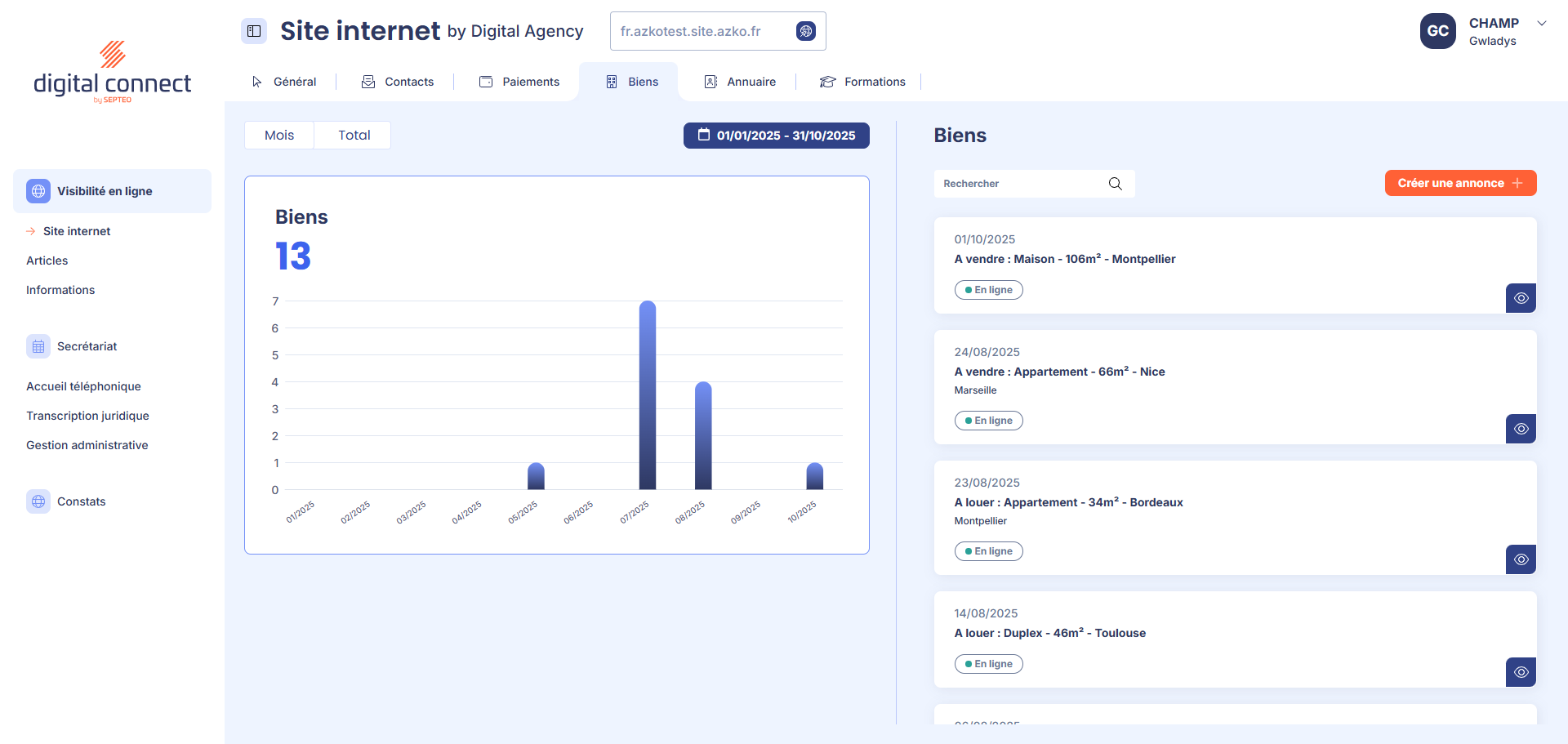 Pour ajouter une annonce immobilière ou un hébergement, il faut se rendre dans Visibilité en ligne > Site internet > Biens ou cliquer sur le bouton “Créer une annonce” depuis la page Visibilité en ligne.