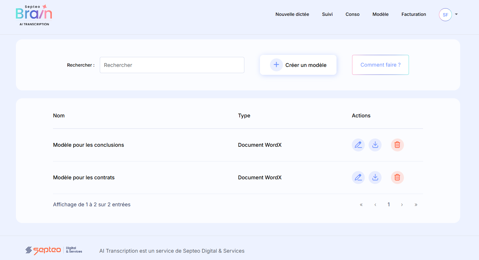 AI Transcription vous permet de transcrire automatiquement vos dictées audio (lettres, conclusions, constats, rapports, etc.) et de les insérer directement dans vos modèles Word personnalisés.